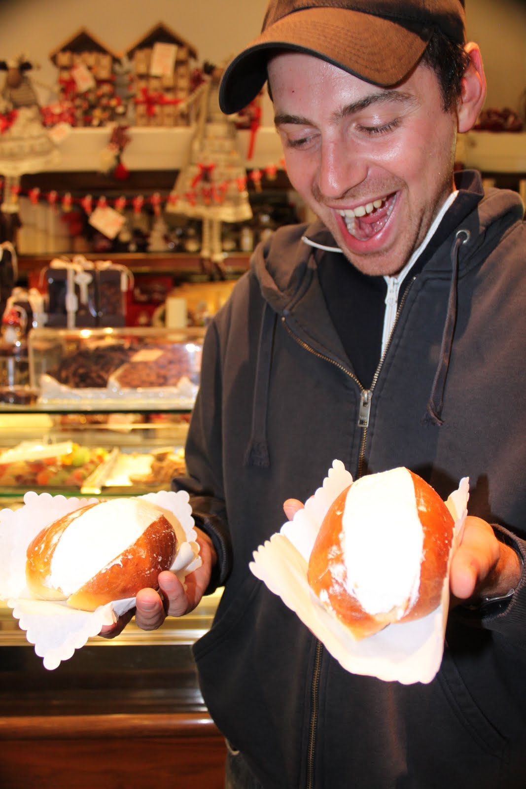 After dinner we went out for the third and final treat of the day - maritozzi. These are sweet brioche cut in half and filled with whipped cream. For such a simple concept, its really a delicious dessert. We are so happy to know people in Rome who can show us the best places in Rome to find all of these new foods!